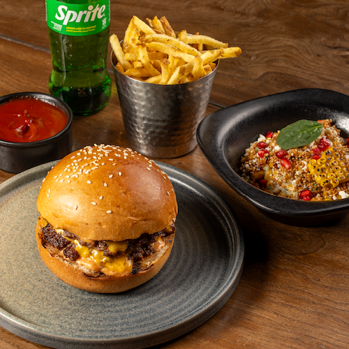 House-made saj bread filled with tender wagyu brisket and sriracha mayo, served with golden potato fries, crisp Caesar salad, and a refreshing soft drink | 900 kcal